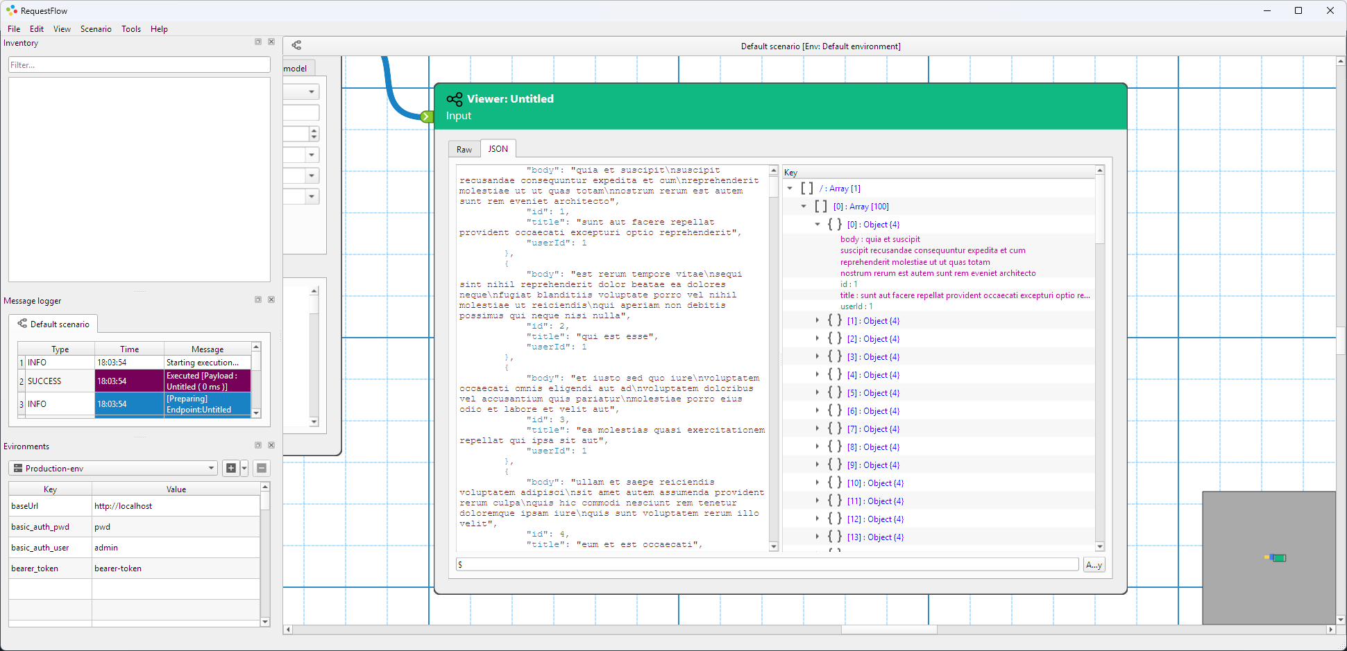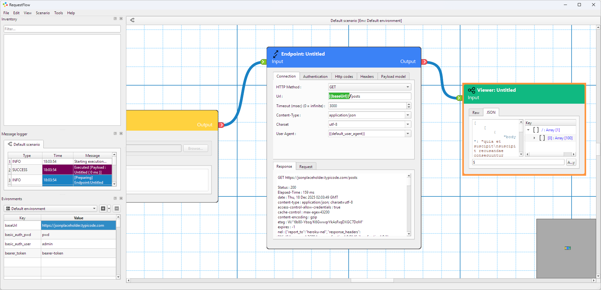 Import Swagger/OpenAPI JSON files. Drag and drop endpoints from Inventory as pre-configured nodes.