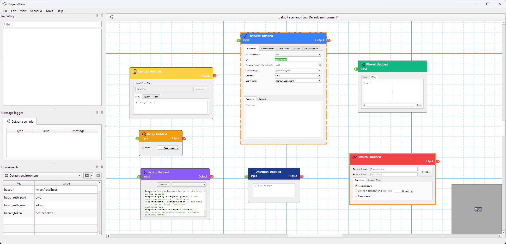 Endpoint, Script, Assertion, Payload, Viewer, Delay, and External nodes. Conditional and Group nodes under development.