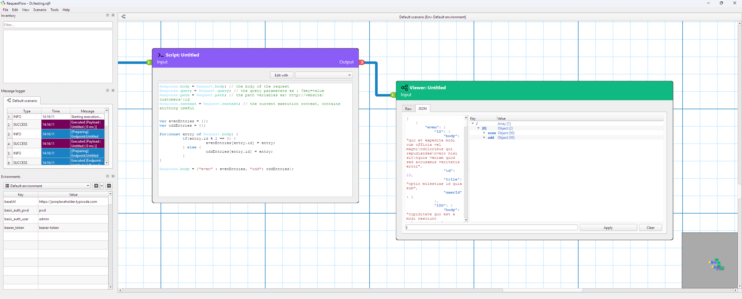 Built-in JavaScript (QJSEngine) with access to Request.body, Request.path, Request.query, Request.context.