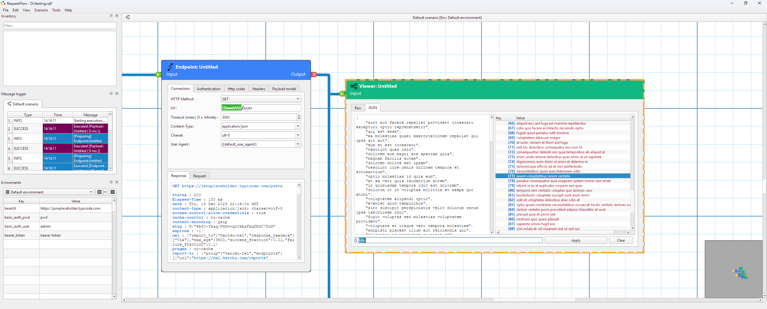 Design API test workflows using drag-and-drop. Connect nodes to create request sequences visually.